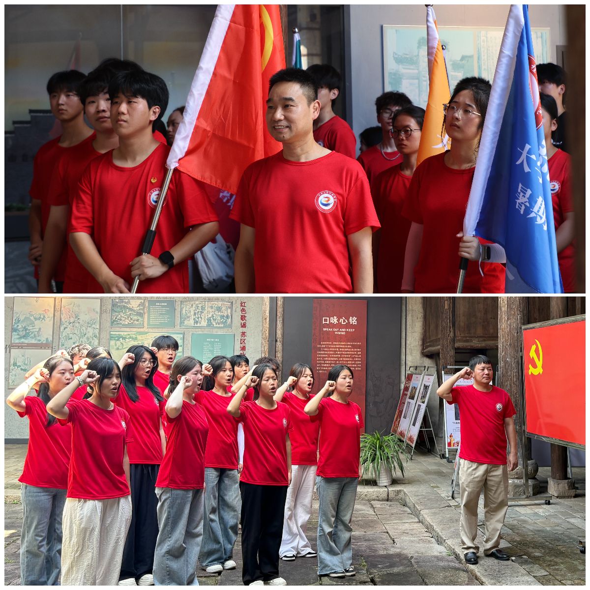 踏入馆内,一股独特的气息扑面而来,那是岁月沉淀下陈木与石灰混合的味道,仿佛在诉说着往昔的故事。在讲解员的引领下,队员们沿着迂回曲折的走廊徐徐前行,逐一学习陈列的标语内容。每一条标语都承载着厚重的革命历史,凝聚着党的宣传智慧,大家沉浸其中,探寻那段波澜壮阔的历史。随后,队员们跟随讲解员学唱当地经典红色歌谣《反对开小差的歌》。激昂的旋律、质朴的歌词,让队员们深切感受到共产党人在艰苦岁月中坚定的革命意志和不屈的奋斗精神。为进一步坚定理想信念,筑牢党性根基,党员教师、学生入党积极分子重温入党誓词和入团誓词。铿锵有力的誓言在大厅内久久回荡,彰显着为共产主义事业奋斗终身的决心。