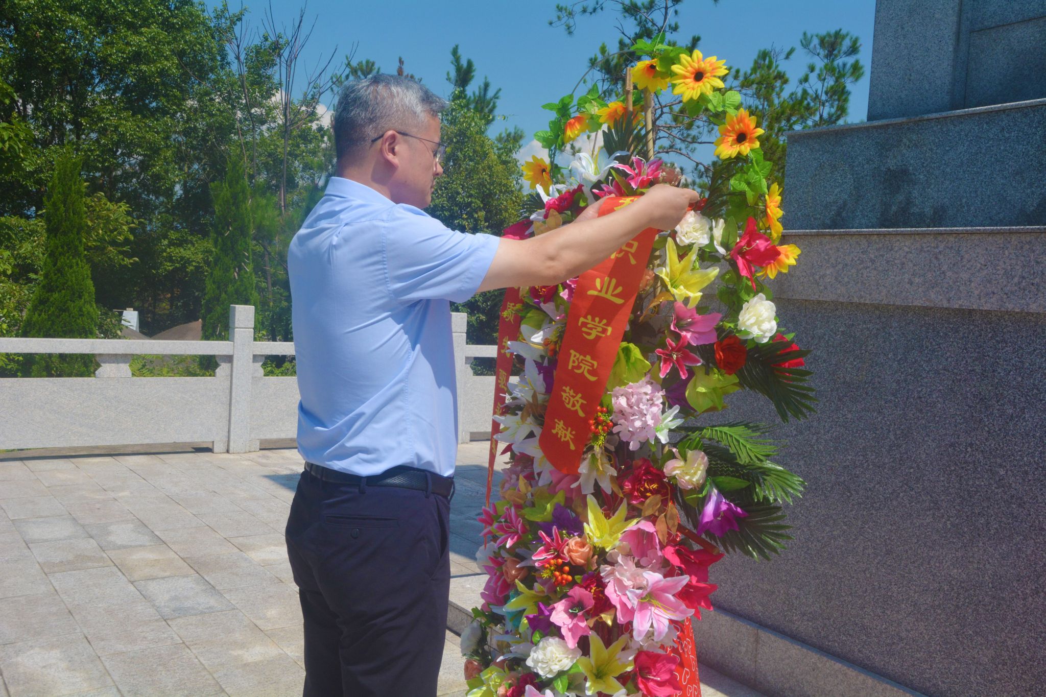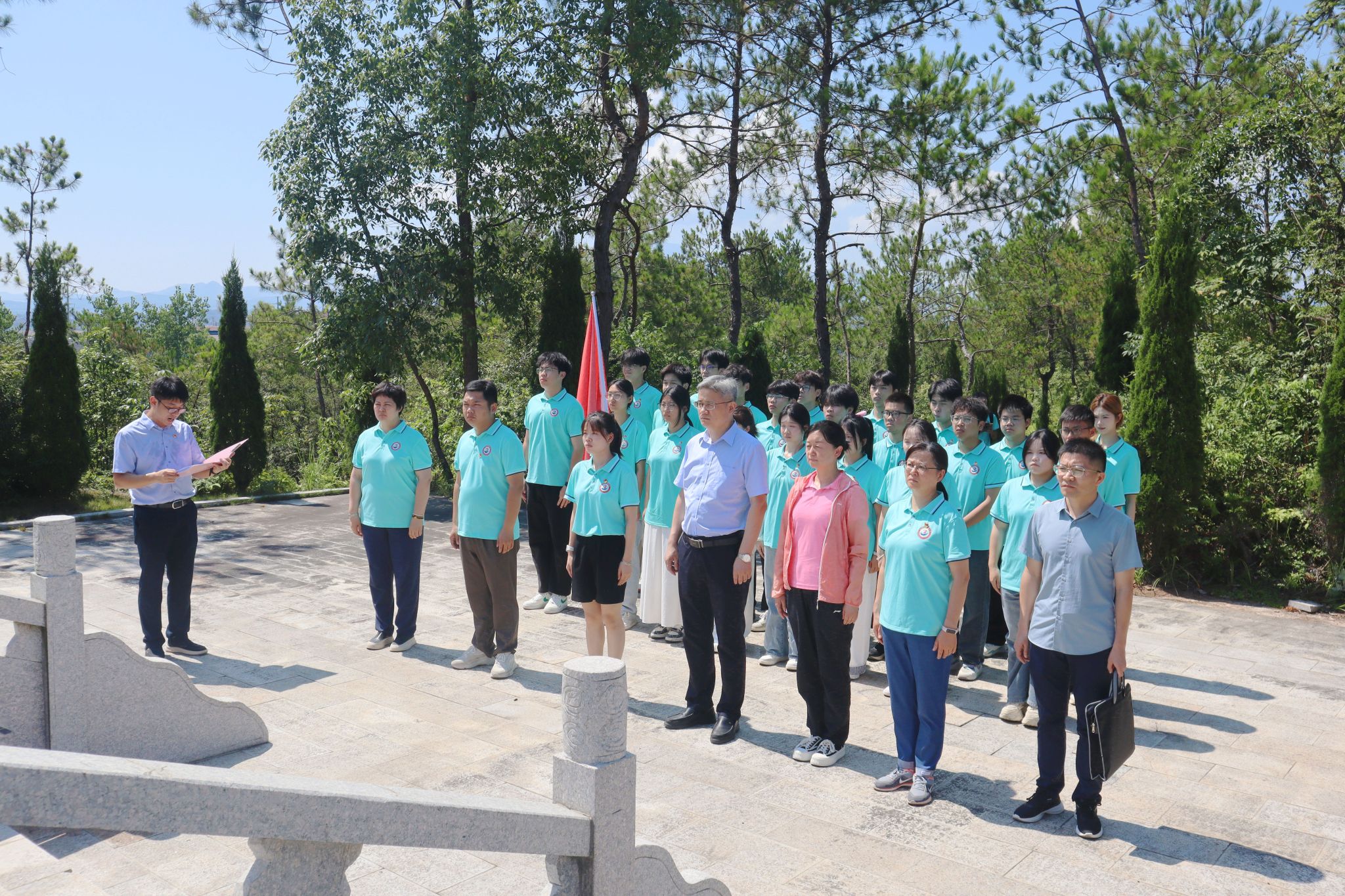 上午,花严红带领暑期大思政实践活动暨“万名大学生进千站”文明实践队队员来到赣核地质先驱纪念碑瞻仰。纪念碑广场松柏苍翠,庄严肃穆。花严红缓步走向纪念碑,仔细整理花篮缎带,与全体队员一同向地质先驱们鞠躬致敬。随后,花严红和队员们到江西省地质局核地质大队老基地参观。人工湖边,老基地的公交车站挂着的斑驳锈迹的站牌,上面写着“一分队”“二分队”“三分队”,仿佛述说着那段艰苦创业的光辉岁月。花严红在公交车站与队员们亲切交流,了解他们的饮食住宿情况,叮嘱大家注意防暑降温。他对实践队的工作表示充分肯定,要求队员们珍惜本次实践机会,活动前精心准备、活动中学习体悟、活动后总结提升,深入挖掘领悟“三光荣、四特别”地质精神,做到举一反三、活学活用,立志成为一名对国家、对社会有用的人。