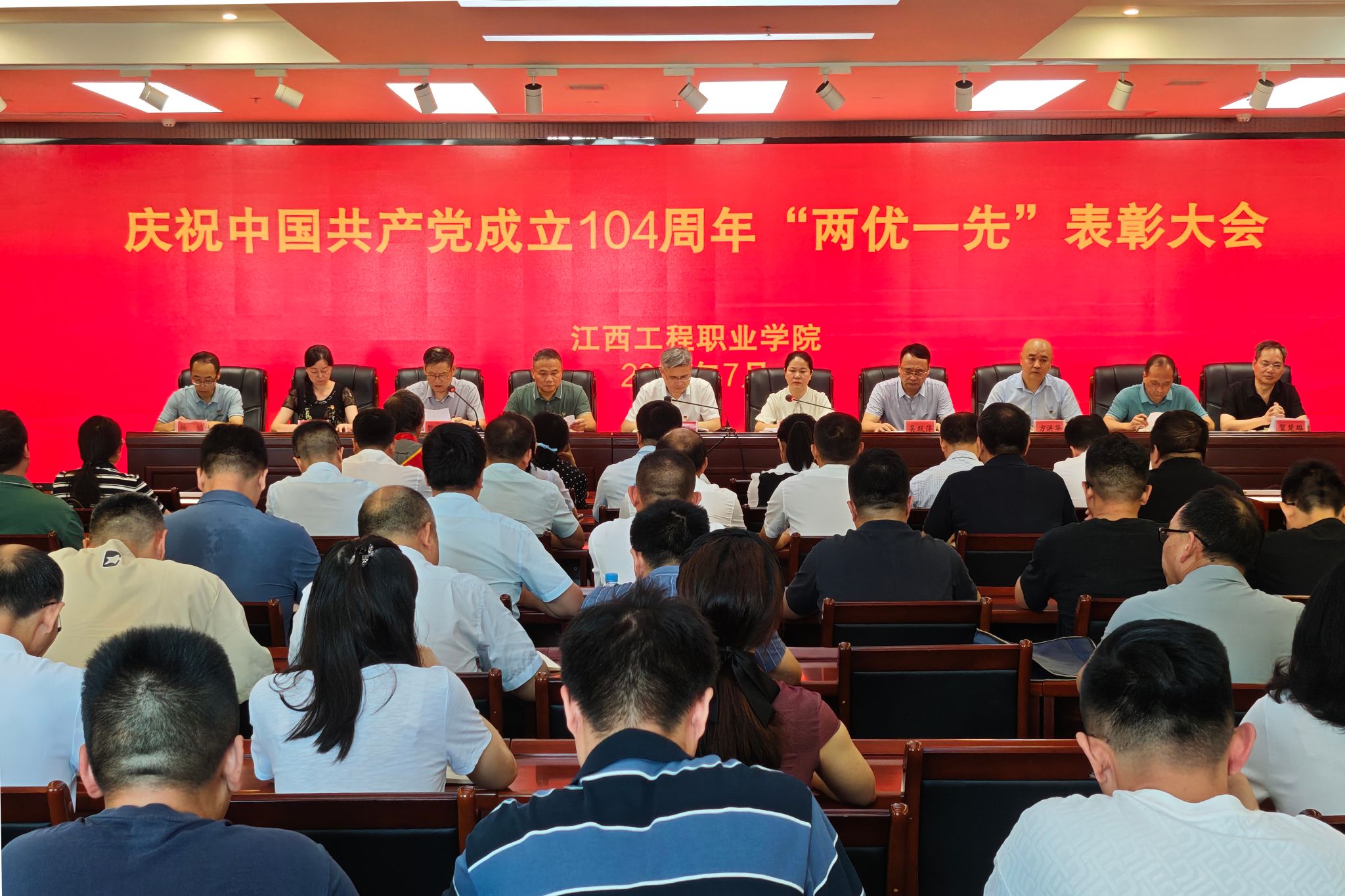 为表彰先进、树立典型,激励全校各级党组织和党员干部踔厉奋发、勇毅前行,7月1日上午,学校召开庆祝中国共产党成立104周年“两优一先”表彰大会。党委书记花严红出席会议并讲话,党委副书记、校长孙江云主持会议,校领导班子成员出席会议。会上,校领导们为老党员代表颁发了“光荣在党50年”纪念章,为受表彰集体和个人颁发荣誉证书和奖牌,致敬他们在党的建设、教育教学、招生就业等领域作出的突出贡献。优秀共产党员代表刘清、先进基层党组织代表卢金林依次上台作了发言。...