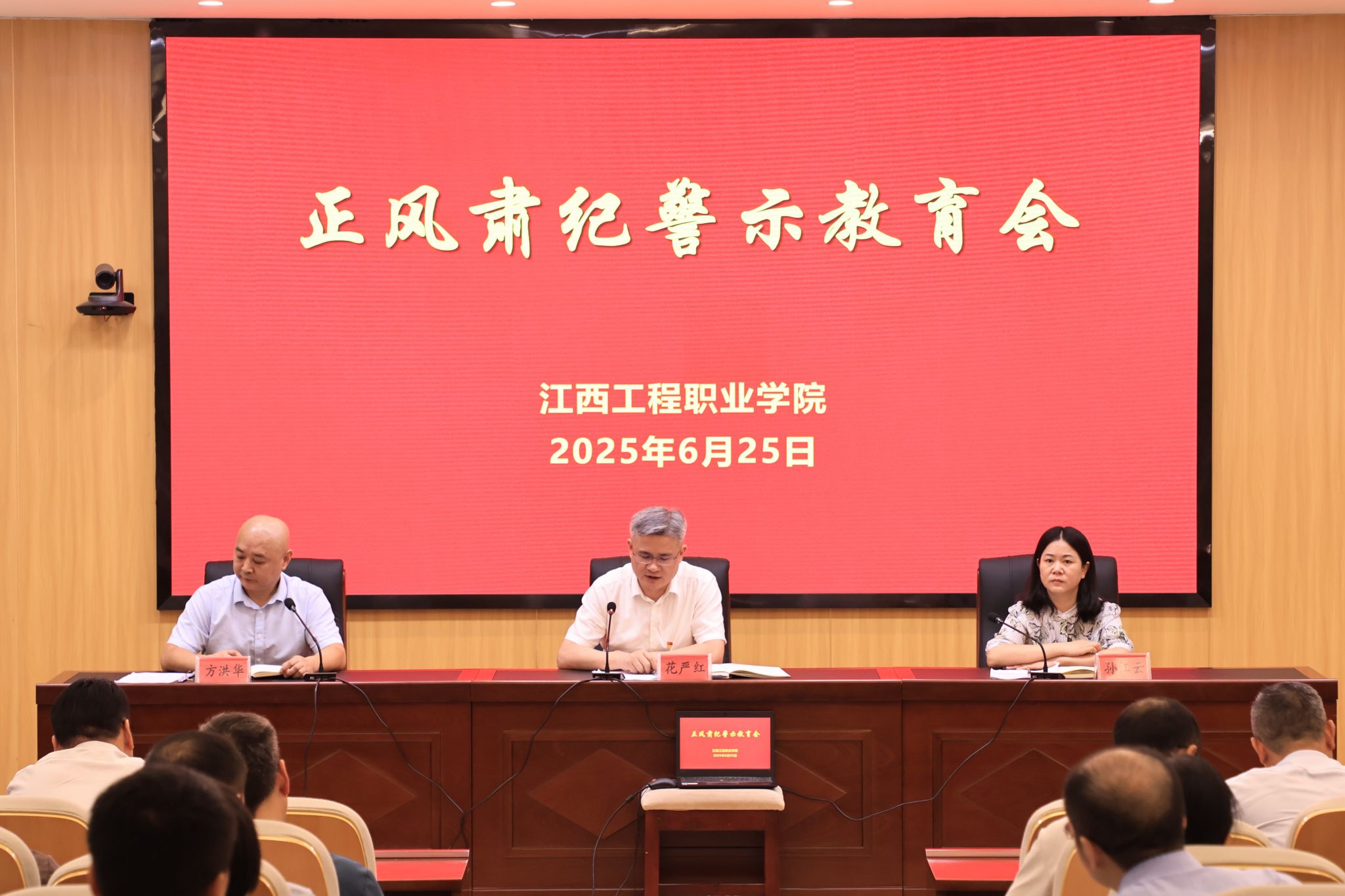 6月25日,我校在京山南路校区召开正风肃纪警示教育会,党委书记花严红主持会议并讲话,党委副书记、校长孙江云传达学习全省正风肃纪警示教育会议精神、全省教育系统正风肃纪警示教育会议精神,党委委员、纪委书记方洪华通报了中央、省级层面和全省教育系统有关违反中央八项规定及其实施细则精神的典型案例。与会人员观看了警示教育片。花严红就深入贯彻落实中央八项规定及其实施细则精神,持续推进正风肃纪反腐,推动学习教育走深走实,...